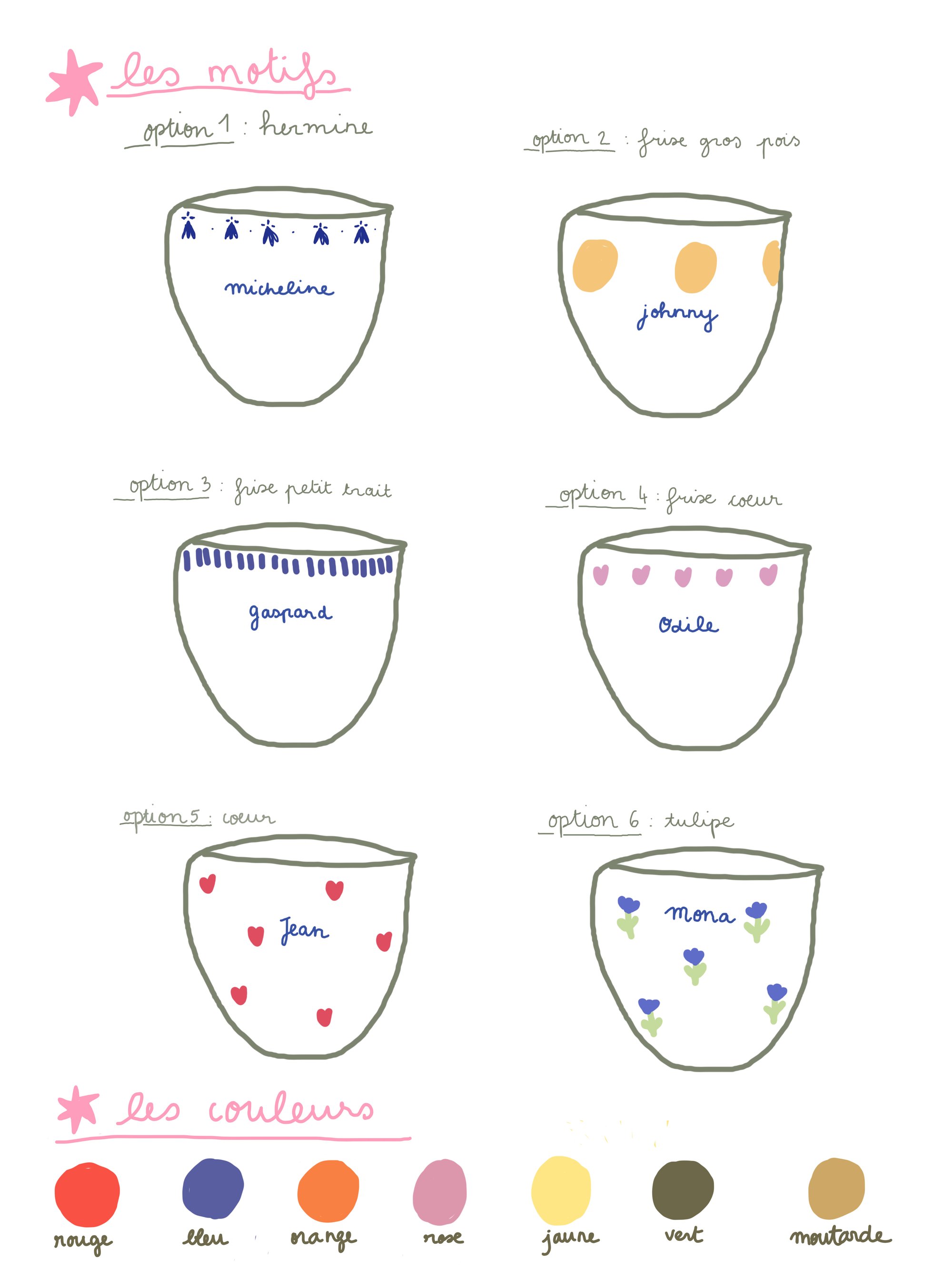 Pour le choix de couleurs , les couleurs sont ici digitales et le rendu une fois peint et cuit sera un peu différent de l'écran ! :)