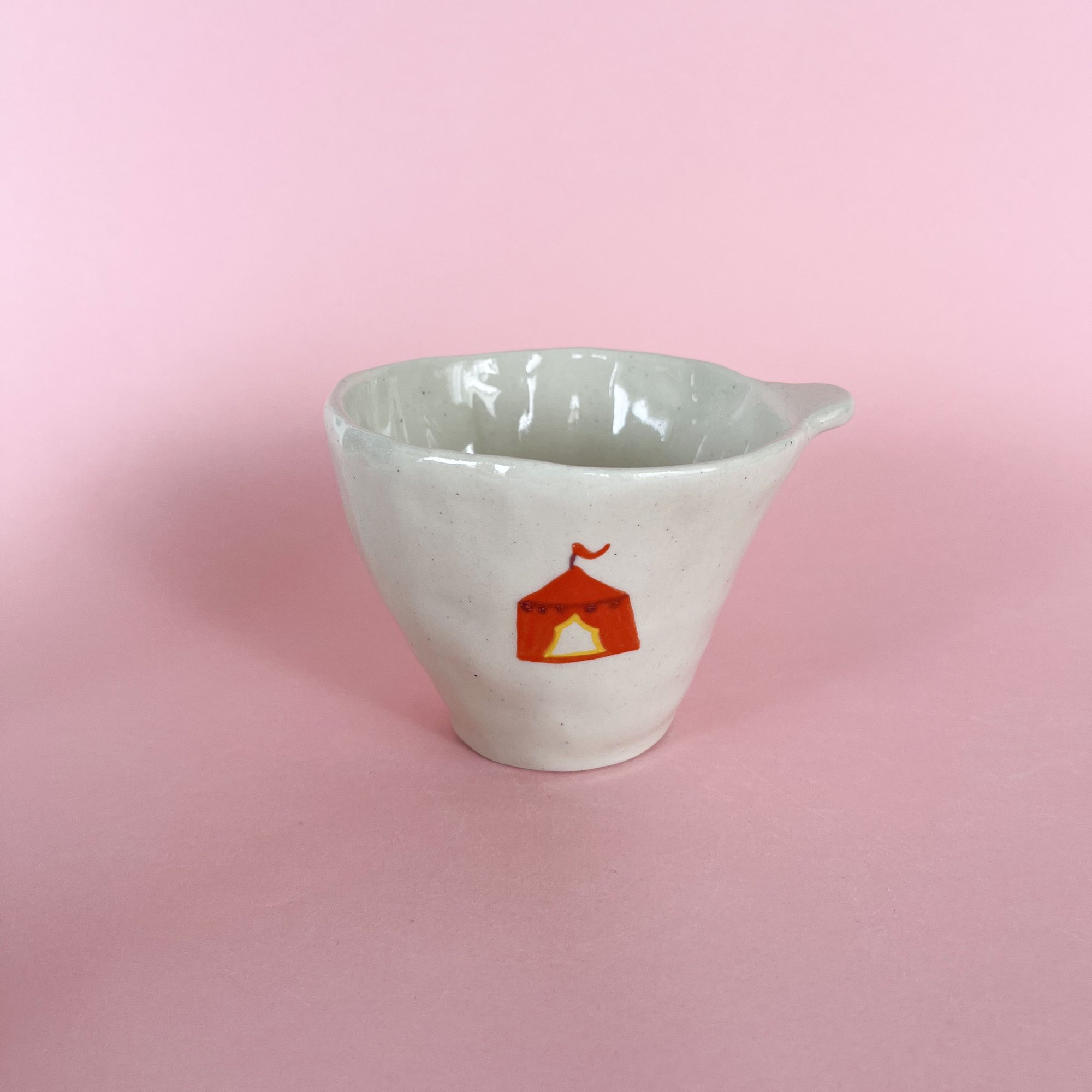 La tasse cirque est d'un côté avec un chapiteau et de l'autre avec l'éléphant sur la balle