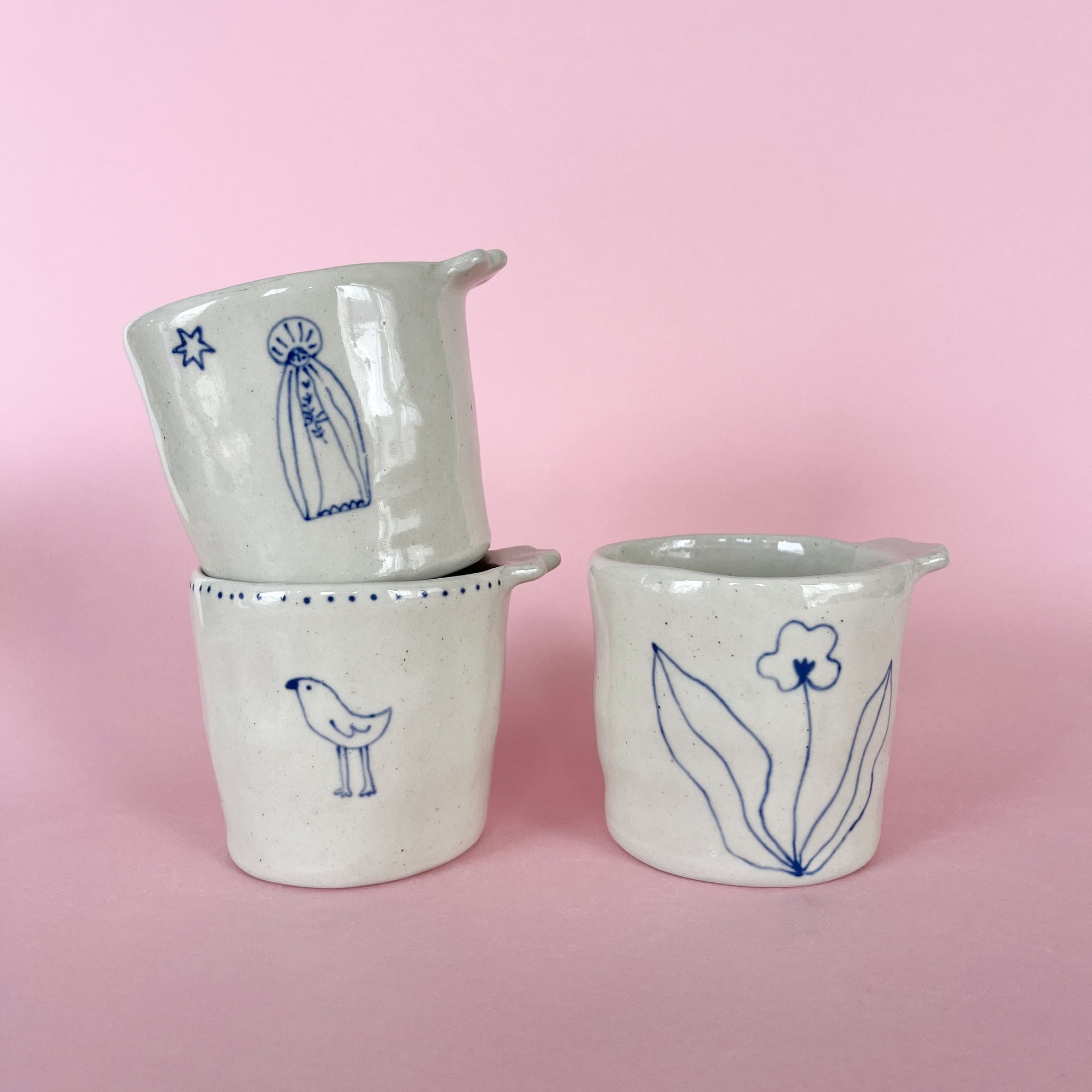 une tasse presque sans anses pour que ça soit plus pratique à ranger dans les placards , mais avec sa petite oreille nuage / fleur pour reposer sur son doigt :) !